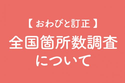 昨年12月23日に発表したこども食堂全国箇所数の調査結果に誤りが見つかりましたので、お詫びして、訂正します。一部自治体の数を重複カウントしていたことが判明しました。むすびえが集計過程でミスを犯しました。ご協力いただいたこ … 続きを読む 【おわびと訂正】全国箇所数調査