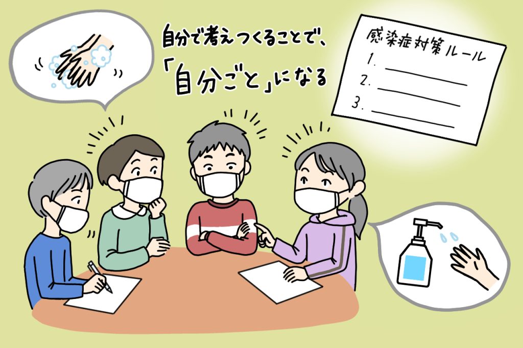 感染対策のルールも、スタッフが規則や縛りを子どもに与えるよりも、子どもたちが話し合いで決めたことを自分たちの手で掲示するほうが、やはりその後も守ってくれますね。