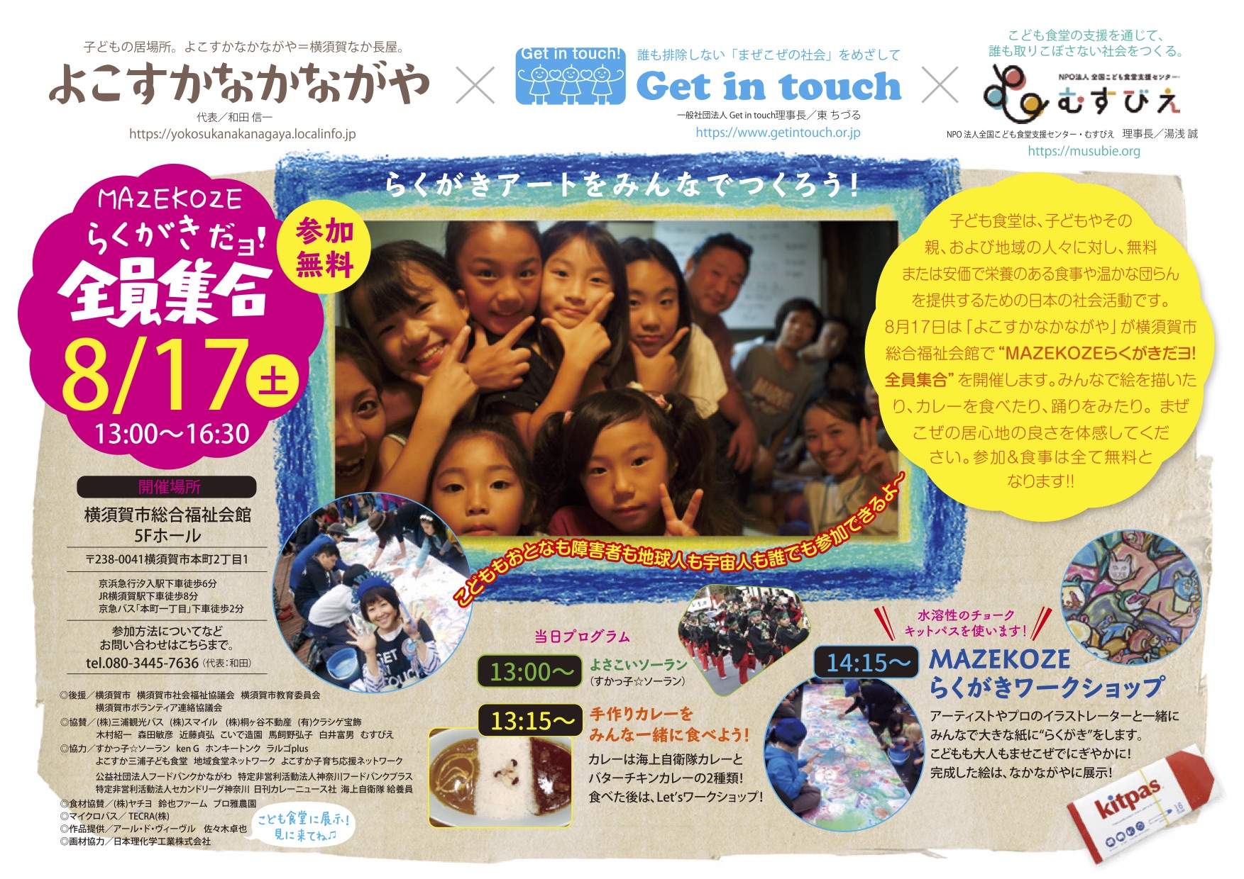 8/17(土)13時〜、誰も排除しない“まぜこぜの社会”の実現に向けて、アートや音楽、舞台、映像などを通じてマイノ リティPR活動を続ける一般社団法人Get in touch(代表:東ちづる)では、子ども達の居場所づくりに取り組んでいる「よこすかなかながや」(代表:和田信一)、そして、むすびえも連携して、参加型 のアートイベント「MAZEKOZEらくがきだヨ!全員集合」を開催します。