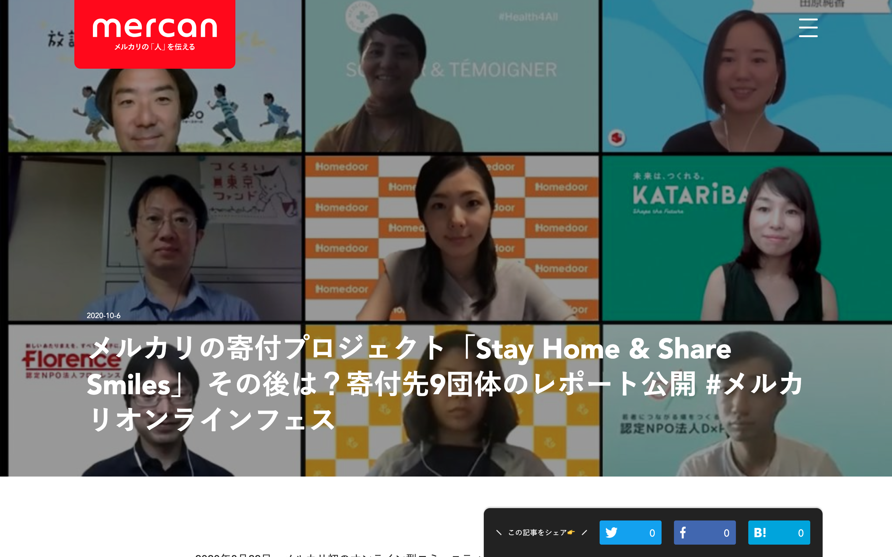 「むすびえ・こども食堂基金」をご支援くださったメルカリ様のオンラインフェス「Stay Home & Share Smiles」にて、活動の報告をさせていただいた様子が、「mercan」に掲載されました。