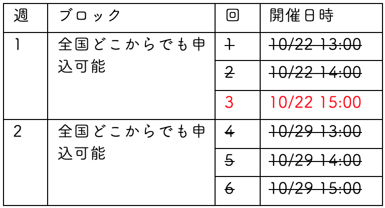 現在、空いているのは1枠(10月22日15時〜)のみです。それを超えた場合、11月以降での日程調整となります(日付未定)。