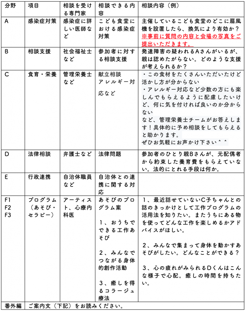 ・「専門家と個別に相談したい!」と希望するこども食堂の方が、各分野の専門家に直接・個別に相談できる場を作ります(1団体あたり50分)。