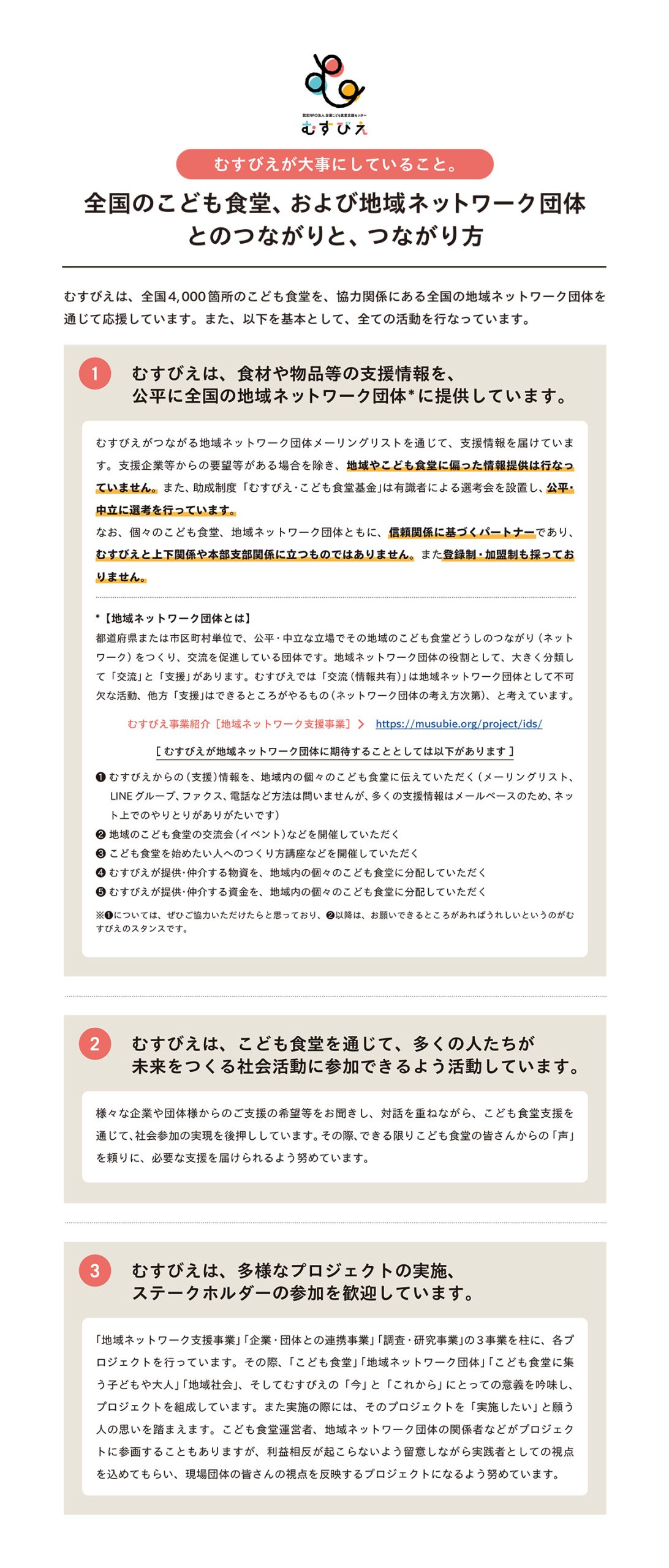 むすびえがこれまでも、これからも「大事にしていること」をお伝えするために、こども食堂や地域ネットワーク団体とのつながりについてまとめました。