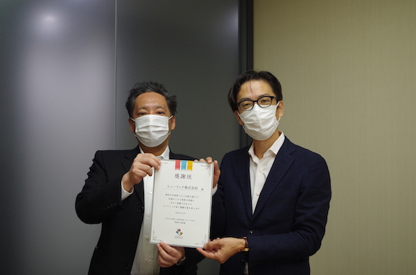 ヒューリック株式会社(東京都・代表取締役社長 吉留 学様)より、希望する従業員から毎月寄付を募るマッチングギフト制度を通じてご支援をいただき、本社にて感謝状の贈呈式を行いました。