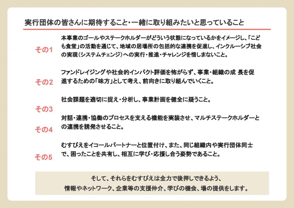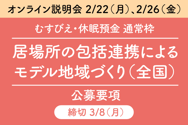 ・本事業の事業期間は2021年度から2023年度の3カ年ですが、システムチェンジへの挑戦を行い、長期的な取り組みの提案を期待しています。また、むすびえの「居場所の包括連携によるモデル地域づくり」事業をともに実施し、失敗とチャレンジを繰り返しながら、成果を追い求めてくださる実行団体を歓迎します。