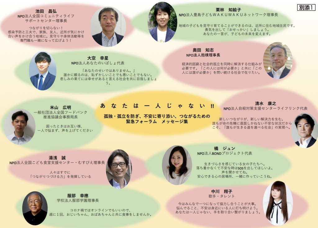 こども食堂の関係者としては、他にNPO法人豊島こどもWAKUWAKUネットワークの栗林知絵子理事長も出席されました。政府の出席者は、菅総理、加藤官房長官の他、新設された坂本哲志 孤独・孤立対策担当大臣、 萩生田文部科学大臣、田村 厚生労働大臣 小泉環境大臣ら、でした。