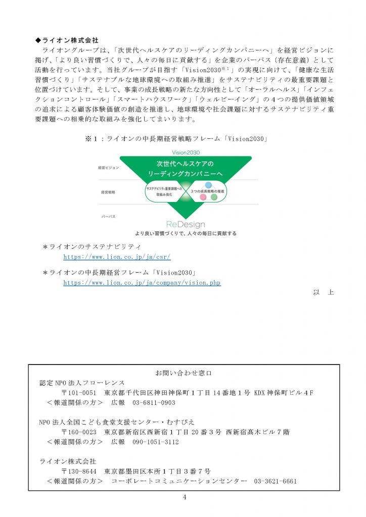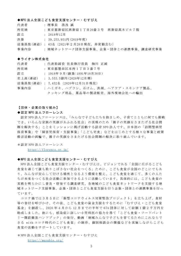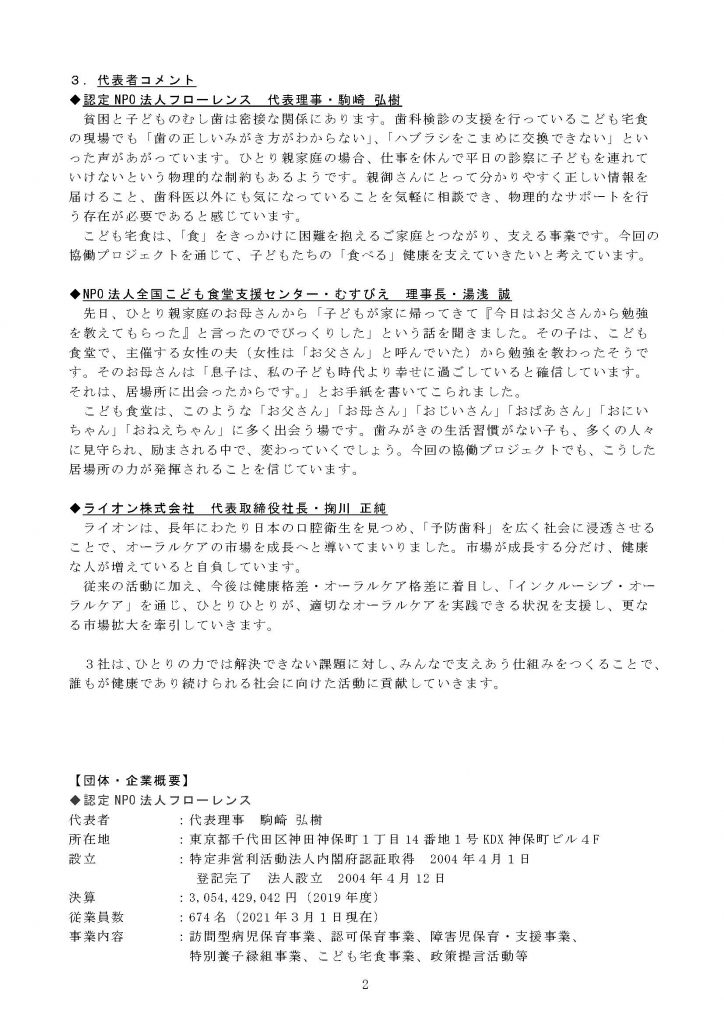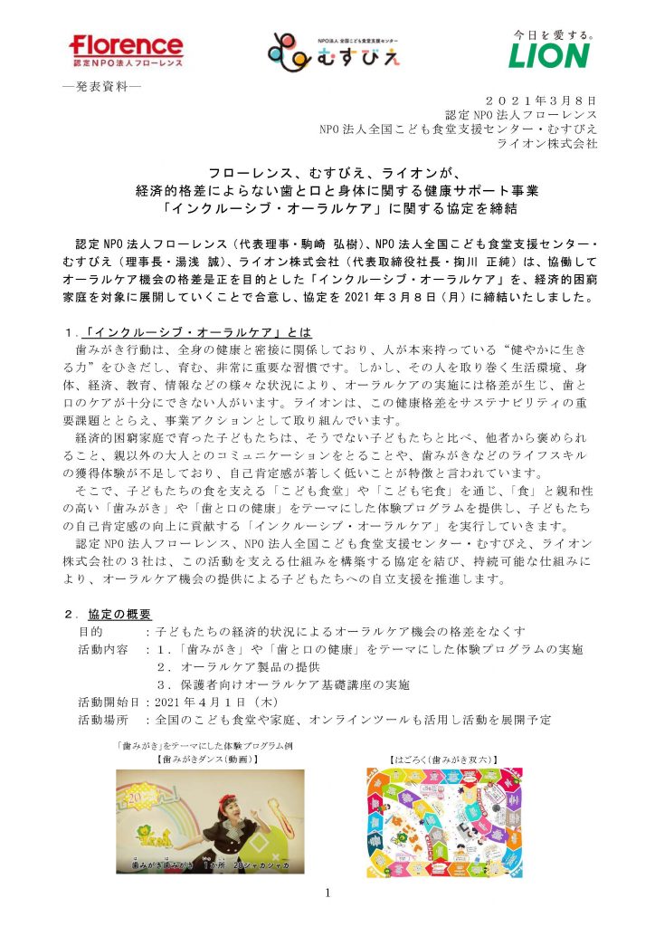 NPO法人全国こども食堂支援センター・むすびえ(理事長・湯浅誠)は、認定NPO法人フローレンス(代表理事・駒崎 弘樹)、ライオン株式会社( 代表取締役社長・掬川 正純)と協働で、オーラルケア機会の格差是正を目的とした「インクルーシブ・オーラルケア」を行うための協定を締結しました。