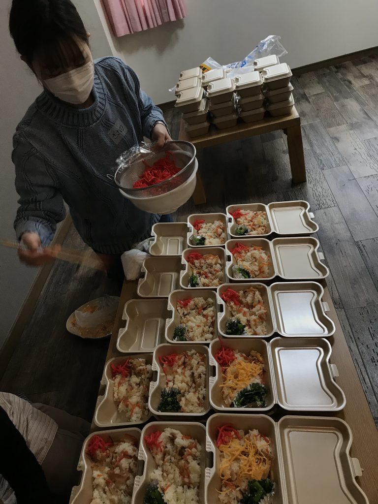 感染症対策のためちらし寿司はテイクアウト用に準備。一部会場で食べていきたいという参加者さんもいらっしゃり、食べるタイムのテーブルは家族ごとに囲みました。両手を使ってモリモリ食べてくれる子どもの食欲に安堵するお母さんの姿も。