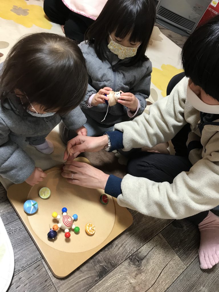 2人のお子さんを連れたお母さんはコマ回しにご自身が夢中に。お相撲さん型のコマは紐を引き抜くタイミングにコツがあります。お母さんが楽しんでいると、お子さんもコマに夢中になりました。