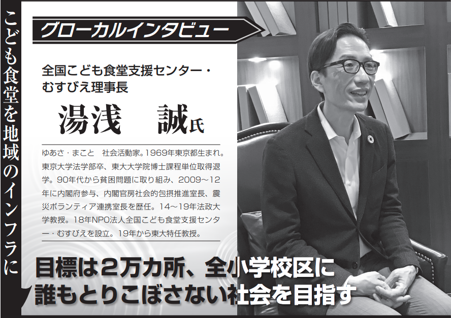 2021-04-12 【メディア掲載】日本経済新聞社「日経グローカル」 メディア掲載 日本経済新聞社「日経グローカル」に、理事長湯浅のインタビューが掲載されました。むすびえは「子どもだけでなく、多世代の人が交流する地域のインフラとして定着させたい」と、全国で2万カ所、全小学校区にこども食堂がある社会の実現を目指しています。 インタビューはWebサイトより閲覧いただけます。https://www.nikkei.co.jp/rim/glweb/ 前の記事 次の記事 新着情報一覧へ