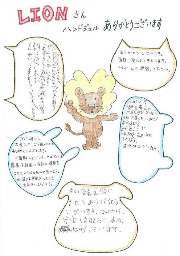 以前から、食中毒の予防には十分注意しておりましたが、今はさらに、コロナウィルス感染予防に努めております。そのために、御社の衛生用品のご寄付は大変ありがたく感じております。(食べる応援6年4組一同)