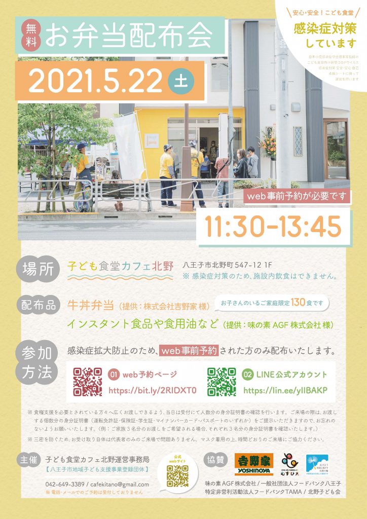 第一弾として、5/22(土)に採択団体のひとつであるフードバンク八王子とつながりのある「子ども食堂カフェ北野」にて牛丼弁当130食の配布を行います。