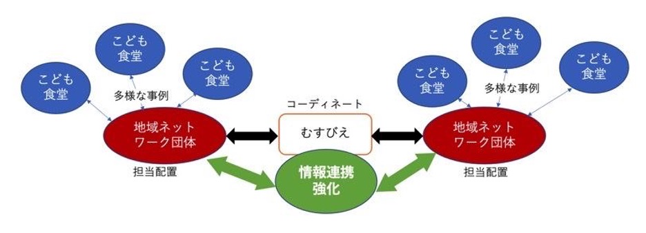 地域ネットワーク団体に「情報収集・発信・集約担当」を1~2名配置していただき、むすびえの「情報連携担当コーディネーター」と連携を図る体制を構築する。
