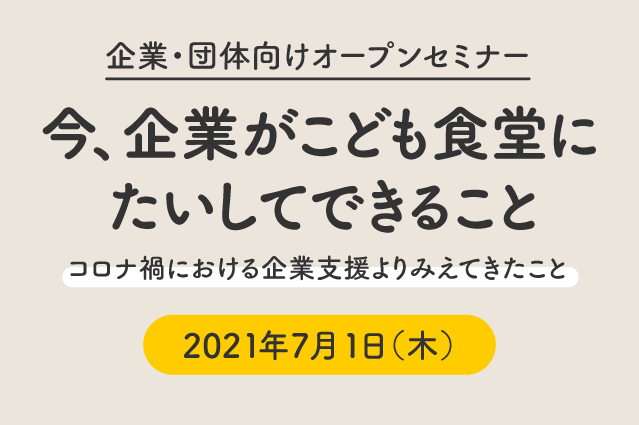 特に、企業・団体の皆さまよりご相談が多い、食材・物資支援に関して、こども食堂を応援するプログラムを実施されている企業・団体の方にお越しいただき、事例をご紹介いただきます。こども食堂との連携を考えたいと思っている企業の方、こどもの居場所づくりに関心のある方はお気軽にご参加ください。
