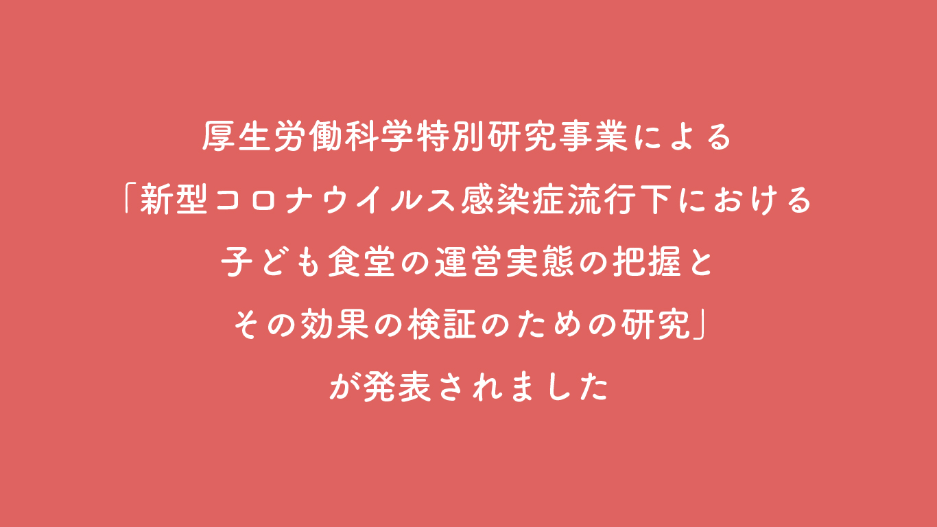 令和2年度 厚生労働科学特別研究事業にておこなわれた「新型コロナウイルス感染症流行下における子ども食堂の運営実態の把握とその効果の検証のための研究」の内容が公開されました。