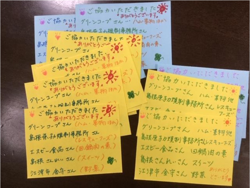 はまだふれあい食堂で今日、60個(1箱)配布しましたので、来月残りの1箱を配布したいと思います。こども食堂という活動にご支援をいただき、また、その輪がさらに広がることを期待しております。この度は本当にありがとうございました。(島根県・はまだふれあい食堂)