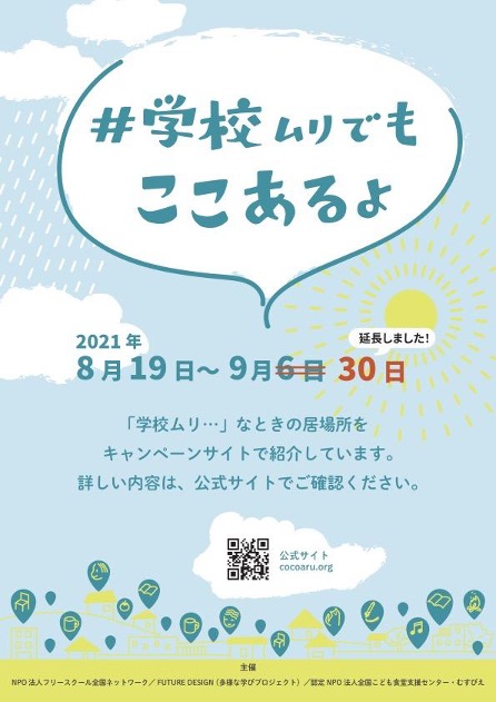 #学校ムリでもここあるよ2021キャンペーン実行委員会は、キャンペーン開催期間 (当初予定2021年8月19日から9月6日まで) を延長し、9月30日まで実施することに緊急決定いたしました。