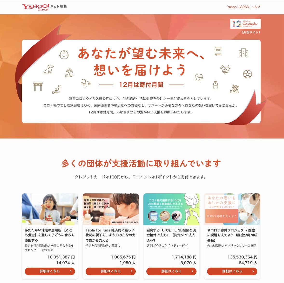 寄付月間の企画としてyahoo!募金が実施される「あなたが望む未来へ、想いを届けよう。」にて、むすびえもご紹介いただいています。