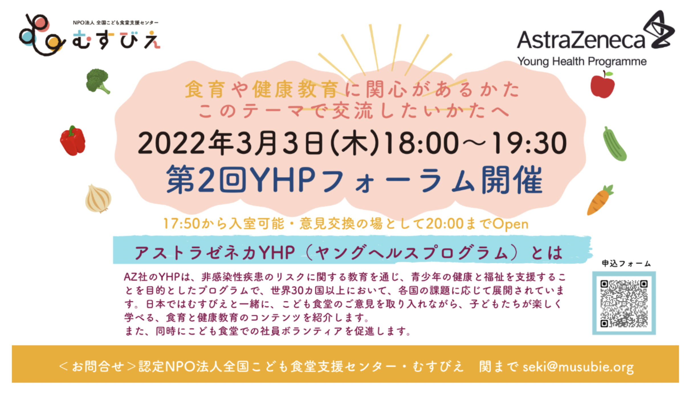 食育や健康教育、アストラゼネカ社員ボランティアに関心のあるこども食堂様のご参加をお待ちしております。意見交換会は20:00までOpenしております。