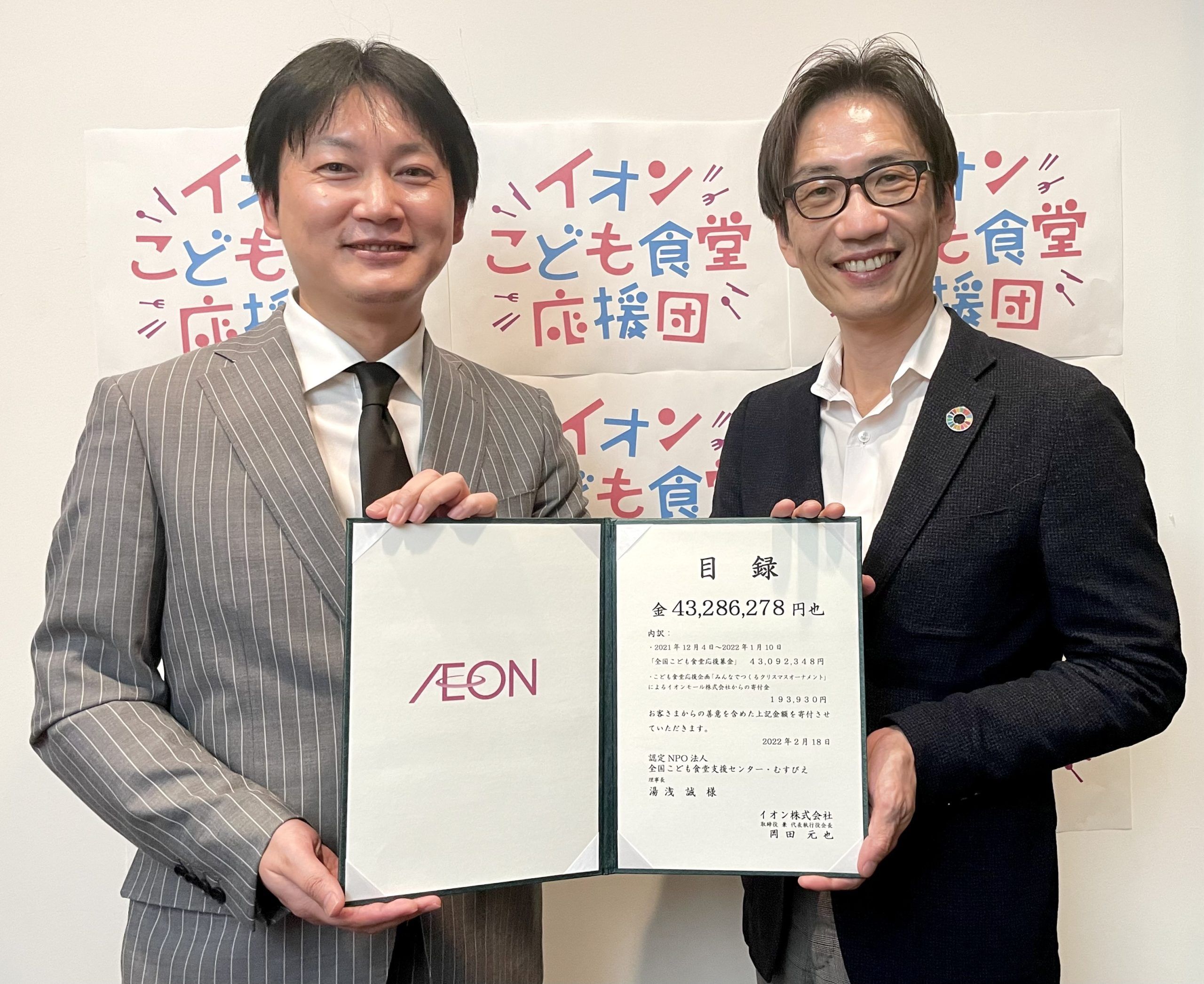 お寄せいただいた募金は43,092,348円となり、これにイオンモール株式会社からの寄付金193,930円を加えた、合計43,286,278円を、2月18日にむすびえに贈呈いたしました。多大なるご支援に、心よりお礼申し上げます。