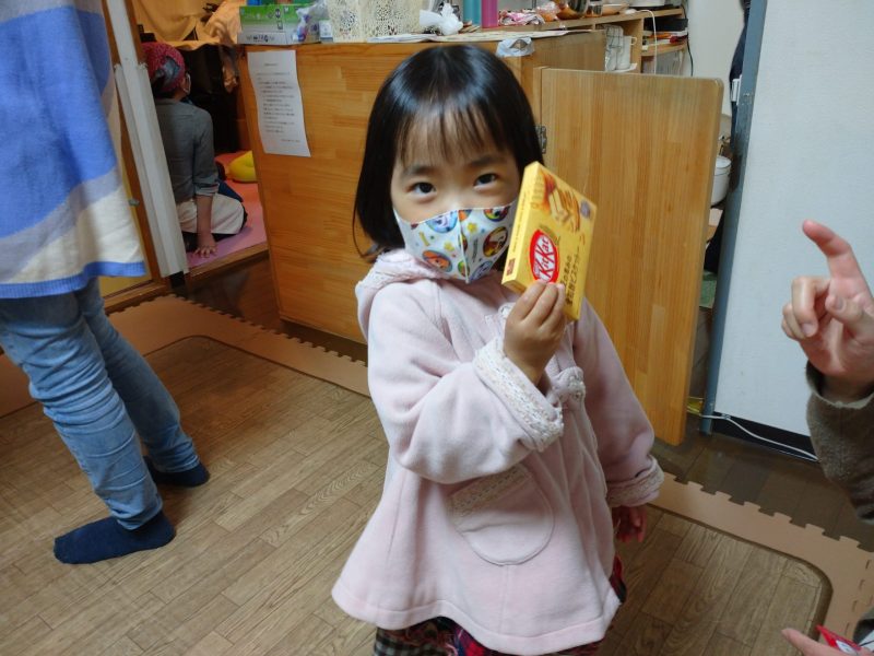 ●私たちの団体は、日頃は高松市の委託を受け、子育て中の親子の支援を幅広く行っております。コロナ禍で孤立する親子を少しでも支援できればと、こども食堂を月に2回、お弁当 のテイクアウトとおすそ分けという形で今年8月から再開しております。 お弁当配布に集まった親子さんに向けて絵本の読み聞かせやわらべうたなどのお楽しみをした後、寄付していただいた食品や日用品、衣類などを「おすそ分け」という形で配布してお ります。この度のネスレ日本株式会社様からの物資の支援も、この「おすそ分け」の機会に配布させていただいております。お子さんたちのお楽しみとして、このようなお菓子は欠かせません。キットカットを手に取った時のお子さんたちの笑顔を私たちスタッフも微笑ましく見守っています。このようなご支援、本当に感謝しております。(香川県:NPО法人子育てネットひまわり)