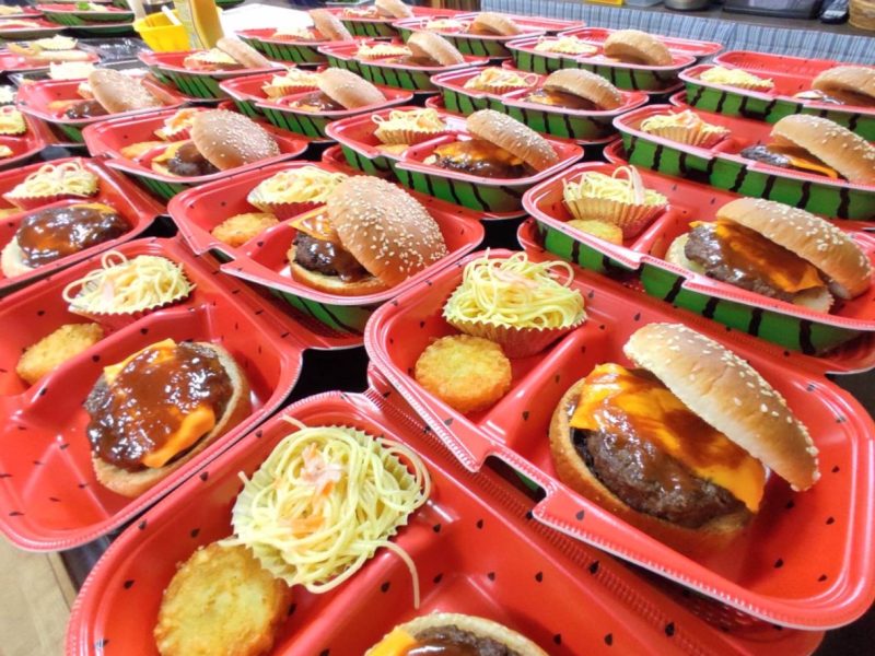 ●本日、11月13日にお弁当配布を致しました。初めてハンバーガー弁当を作りましたが、先日ご支援を頂いた、幕の内弁当箱(スイカ柄)がピッタリでした!とても可愛らしい見た目になり、子ども達も大喜びでした。(香川県:たくまこども食堂「はぴねすカフェ」)