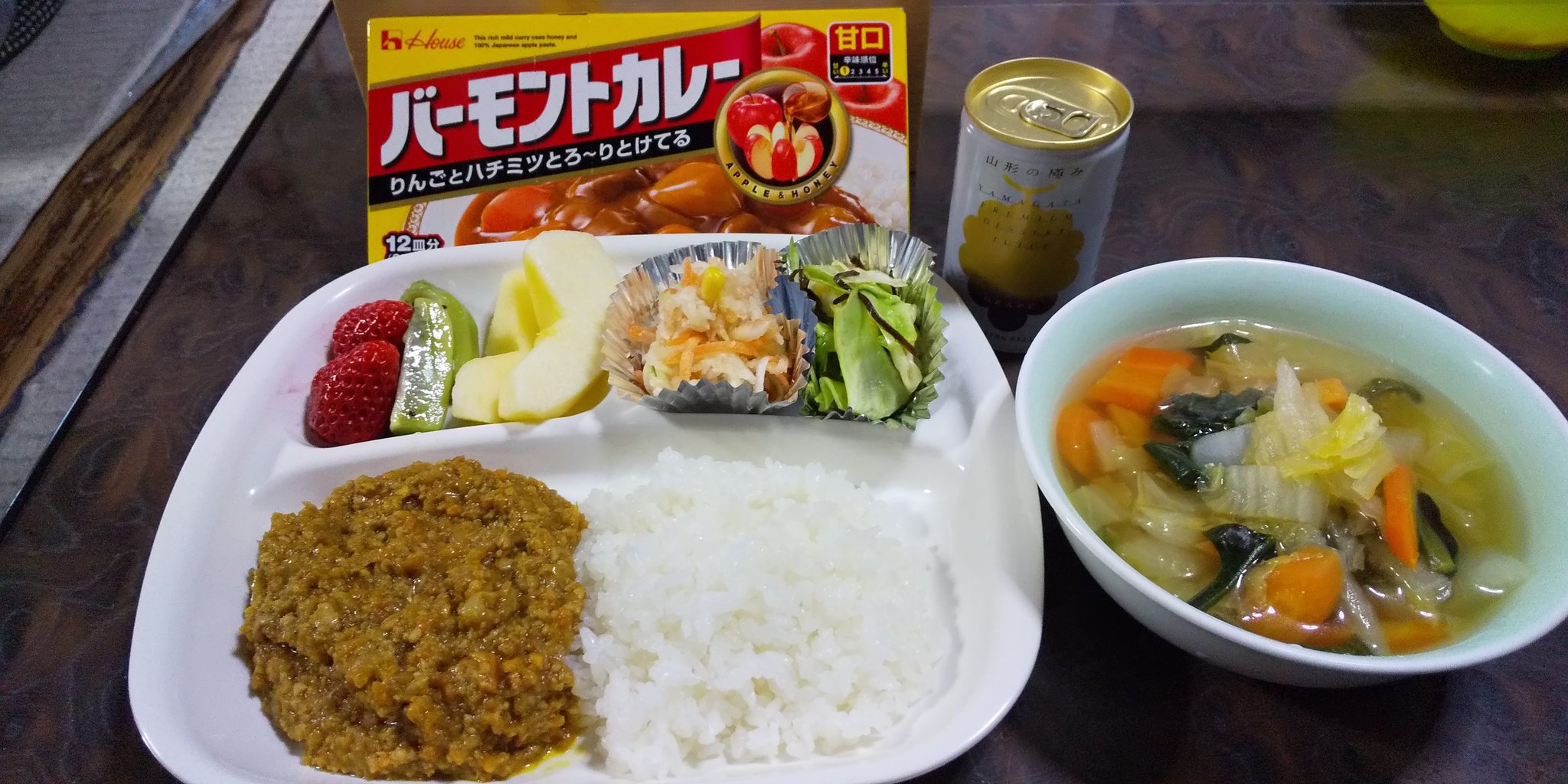 【メニュー】カレーライス、ほうれん草のスープ、ブロッコリー、フルーツポンチ、バナナでした。