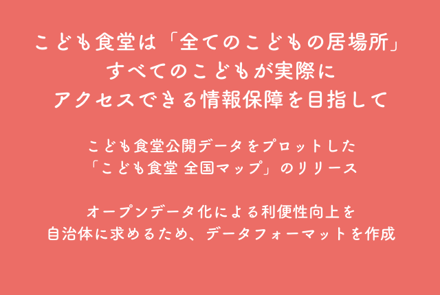 全国にある6,000箇所を超えるこども食堂に、すべてのこどもがアクセスでき、「すべてのこどものための居場所」になるためには、基本的な前提として「そもそもどこにあるかがわかる」情報保障が必要になります。