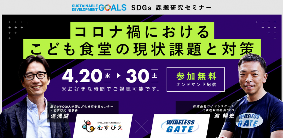 『こども食堂応援Wi-Fi 〜conneXion for SMILE〜』を通したむすびえへのご寄付をいただいている、株式会社ワイヤレスゲートと共同開催で「コロナ禍におけるこども食堂の現状課題と対策」をテーマにしたセミナーを2022年4月20日~2022年4月30日に開催致します。