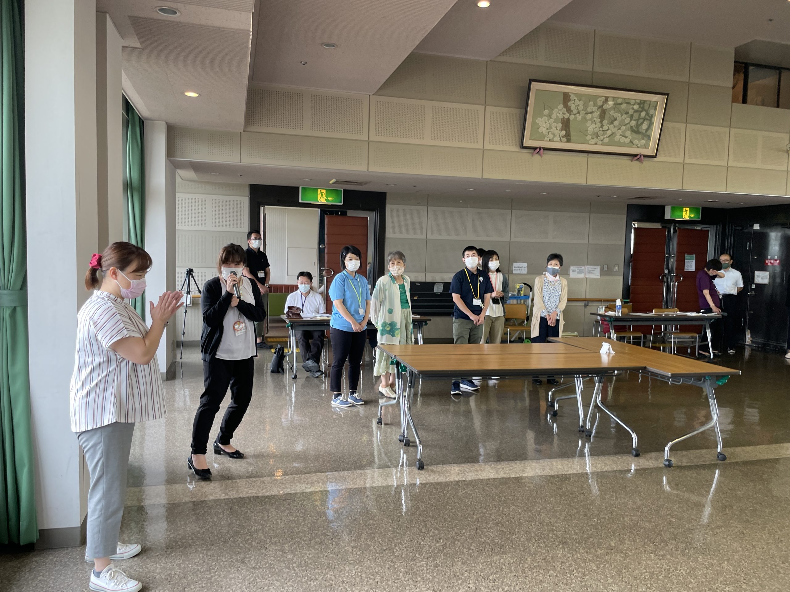 その後、会議室の後方を「こども食堂」に見立てて、防災訓練を開催。