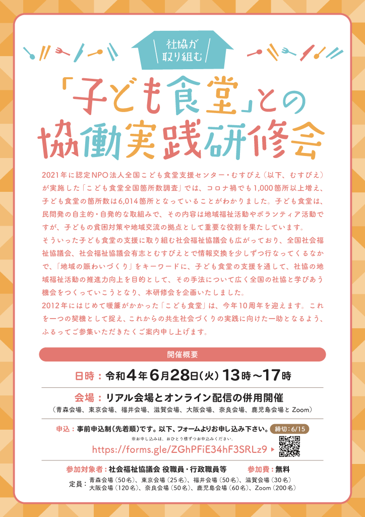 そういった子ども食堂の支援に取り組む社会福祉協議会も広がっており、全国社会福祉協議会、社会福祉協議会有志とむすびえは、情報交換を行なってくるなかで、「地域の賑わいづくり」をキーワードに、子ども食堂の支援を通して、社協の地域福祉活動の推進力向上を目的として、その手法について広く全国の社協と学びあう機会をつくっていこうとなり、本研修会を企画いたしました。