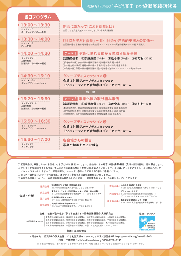 定員:青森会場(50名)、東京会場(25名)、福井会場(60名)、滋賀会場(30名)、大阪会場(120名)、奈良会場(50名)、鹿児島会場(60名)、Zoom(200名)