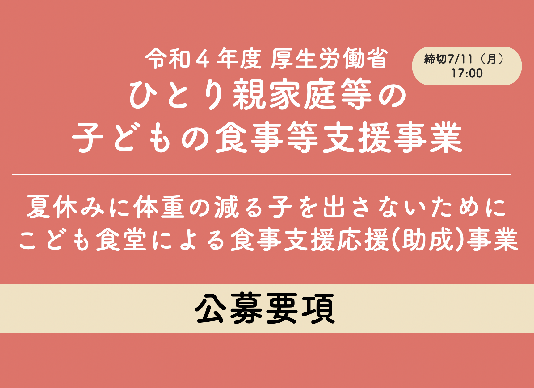 このたび、「夏休みに体重の減る子を出さないために こども食堂による食事支援応援(助成)事業」(令和4年度厚生労働省「ひとり親家庭等の子どもの食事等支援事業」)(以下「本事業」)を実施します。