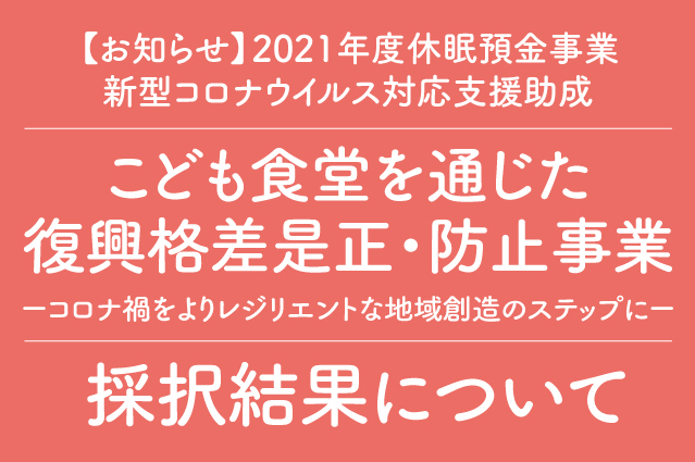 2021年度休眠預金事業新型コロナウイルス対応支援助成「こども食堂を通じた復興格差是正・防止事業 ーコロナ禍をよりレジリエントな地域創造のステップにー」採択結果につきまして、以下の通り発表いたします。