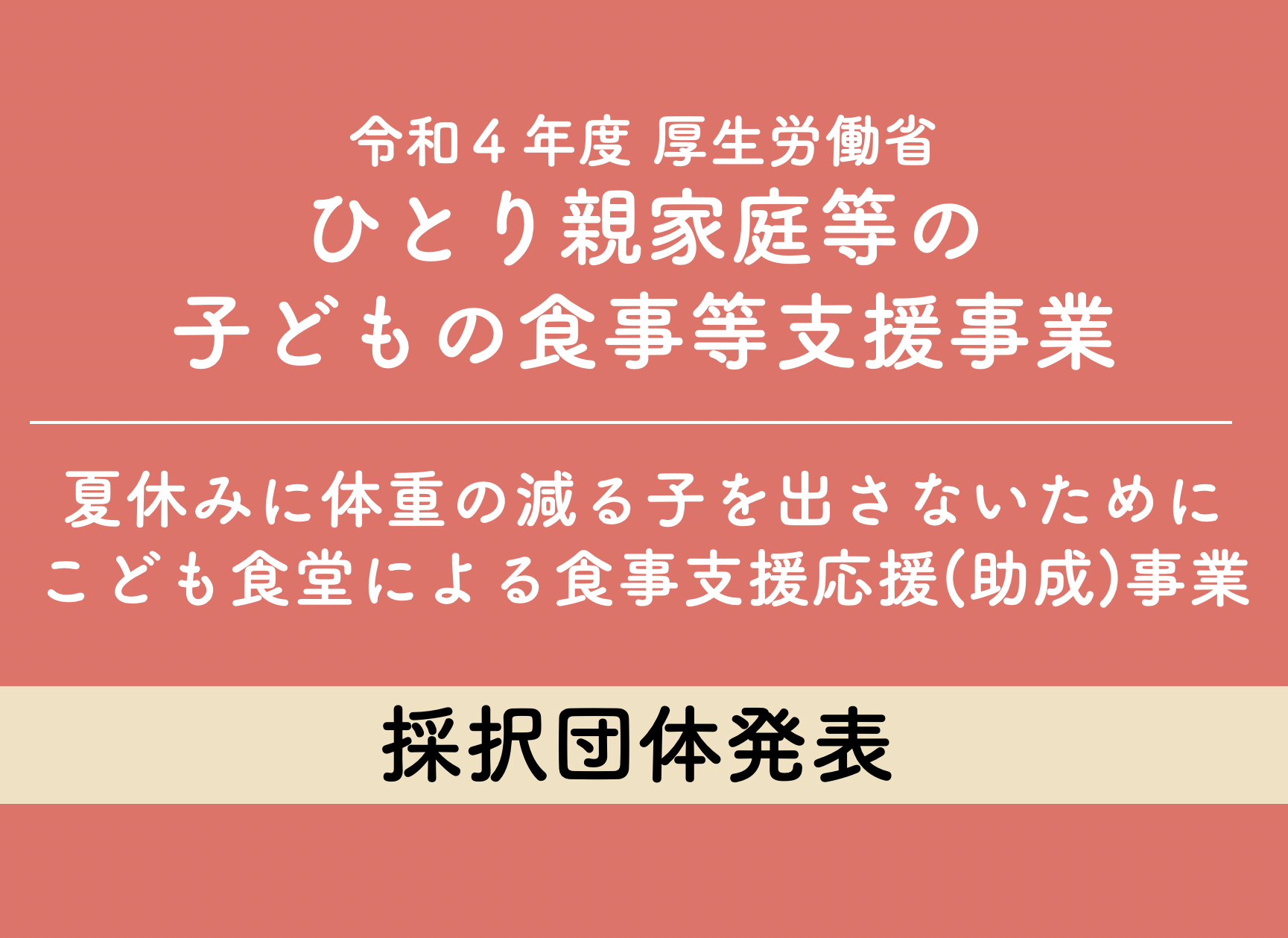 令和4年度厚生労働省「ひとり親家庭等の子どもの食事等支援事業」「夏休みに体重の減る子を出さないために こども食堂による食事支援応援(助成)事業」における採択団体を発表いたします。