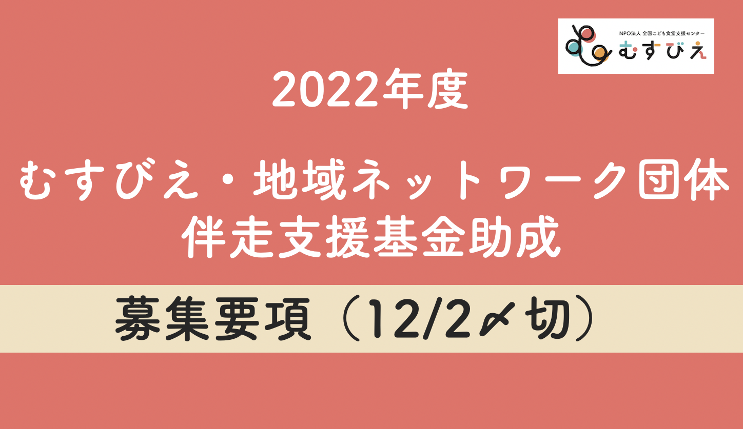 | 認定NPO法人全国こども食堂支援センター・むすびえ 「むすびえ・地域ネットワーク団体伴走支援基金助成」事務局宛 Email: bsk2022@new-musubiesan-test.kz-test.xyz 件名:【2022助成応募】団体名 |