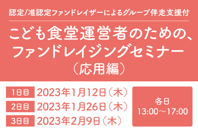 こども食堂、こども食堂地域ネットワーク団体の方で、ファンドレイジングセミナー(むすびえ以外の団体が提供しているセミナーも含む)に参加したことがあり基礎的な知識がある方。むすびえ主催のファンドレイジングセミナー基礎編(昨年度、今年度)、日本ファンドレイジング協会主催の准認定ファンドレイザー必修研修受講された方を推奨します。