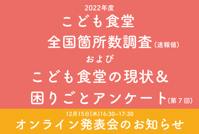 また、こども食堂を運営する上で抱えている課題や困りごとを調査する第7回「こども食堂の現状&困りごとアンケート」も実施しましたので、箇所数調査の結果(速報値)に加えて、困りごとアンケート結果の内容もお伝えします。