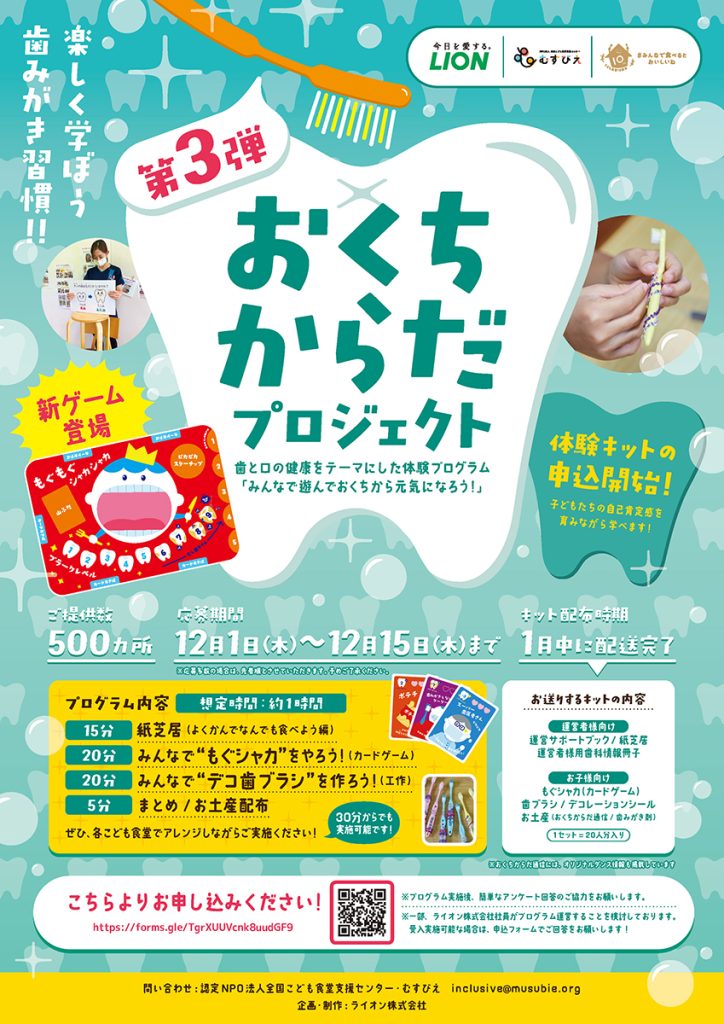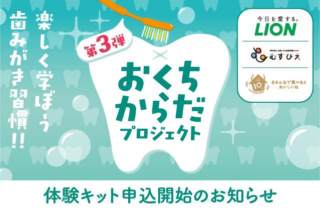 むすびえは、2021年3月に、ライオン株式会社と歯と口と身体に関する健康サポート事業「インクルーシブ・オーラルケア」に関する協定を締結し、一緒にプログラム開発、テスト実施を進め、昨年9月からは、ライオン「おくちからだプロジェクト」より、「歯と口の健康を通じて自己肯定感の向上を目指した体験キット」第1弾・第2弾を実施し、大変ご好評をいただきました!
