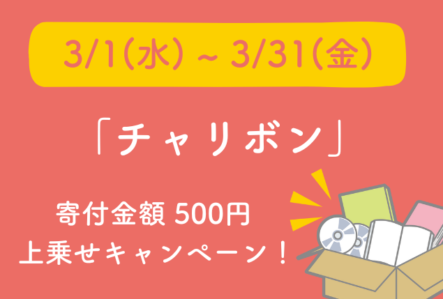 3/1-3/31までの期間、申し込み一件あたり寄付金額¥500上乗せキャンペーンが開催されます!この機会にぜひ、読み終えた本や見終えたDVDなどを通した寄付をしてみませんか?