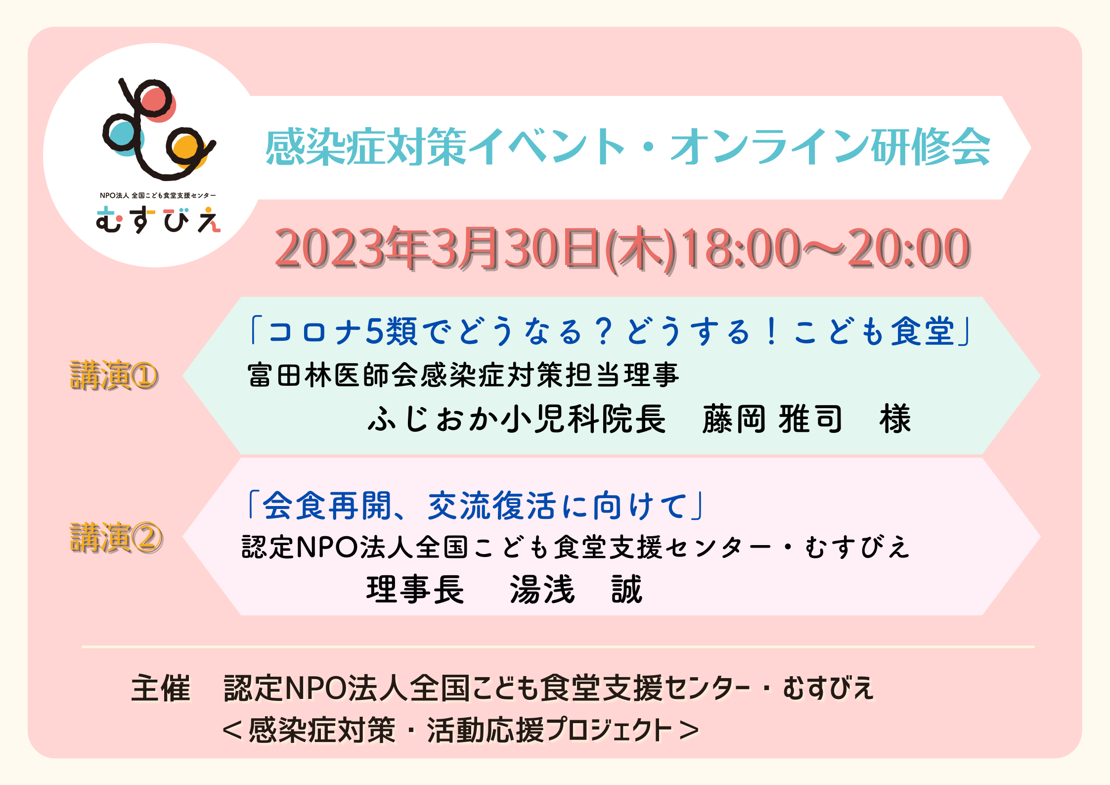 3月30日のオンライン研修会では、感染症対策コンテンツの制作にも協力していただいた藤岡雅司先生に、5類に変わった際の必要な対応などについてご講演いただきます。これまでお弁当や食材の配布として活動されていたこども食堂運営者の皆さまが、会食形式での開催を検討する際に参考になる情報が提供できればと思っています。