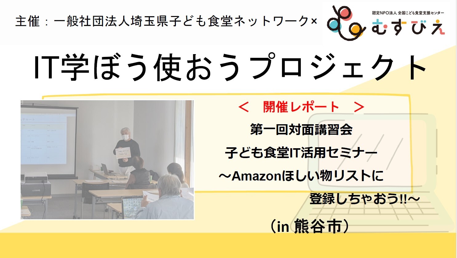 むすびえは、埼玉県子ども食堂ネットワークと共催のもと、「 子ども食堂IT活用セミナー~Amazonほしい物リストに登録しちゃおう!!~」第一回を、2023年1月29日(日)埼玉県北部の熊谷エリアで開催しました。この企画は、むすびえ、埼玉県子ども食堂ネットワーク、大学生ボランティア、企業サポーターの四者協働として、埼玉県下のこども食堂運営者へ対面でIT支援を行います。昨夏行ったオンライン講座「Amazonほしい物リスト活用ゼミナール」の復習と、実際にご自分のデバイスを操作して「ほしい物リスト」と「みんなで応援プログラム」の登録を完了するまでがゴールです。
