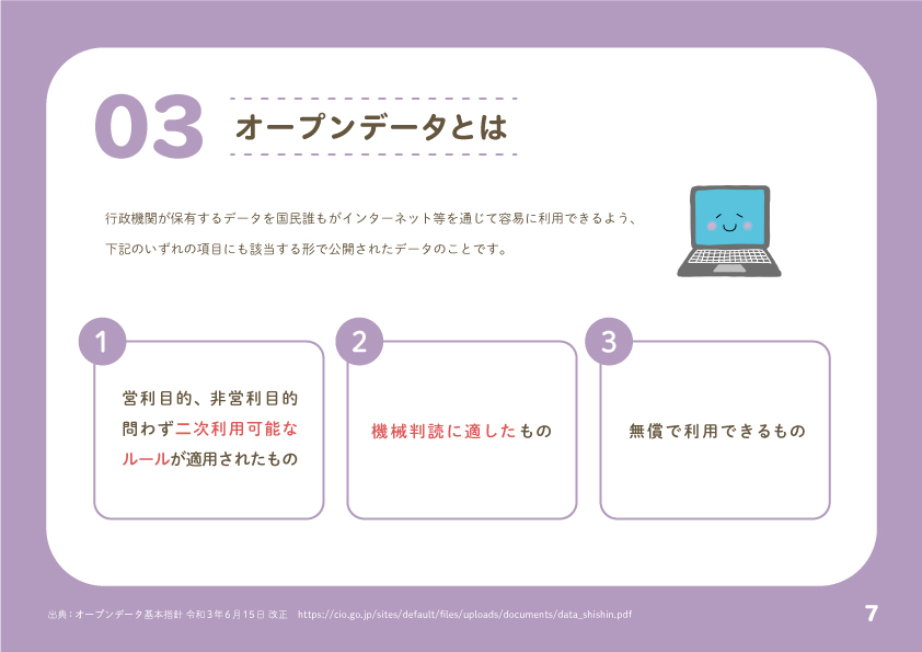 オープンデータとは、行政機関が保有するデータを国民誰もがインターネット等を通じて容易に利用できるよう、公開されたデータのことです。
