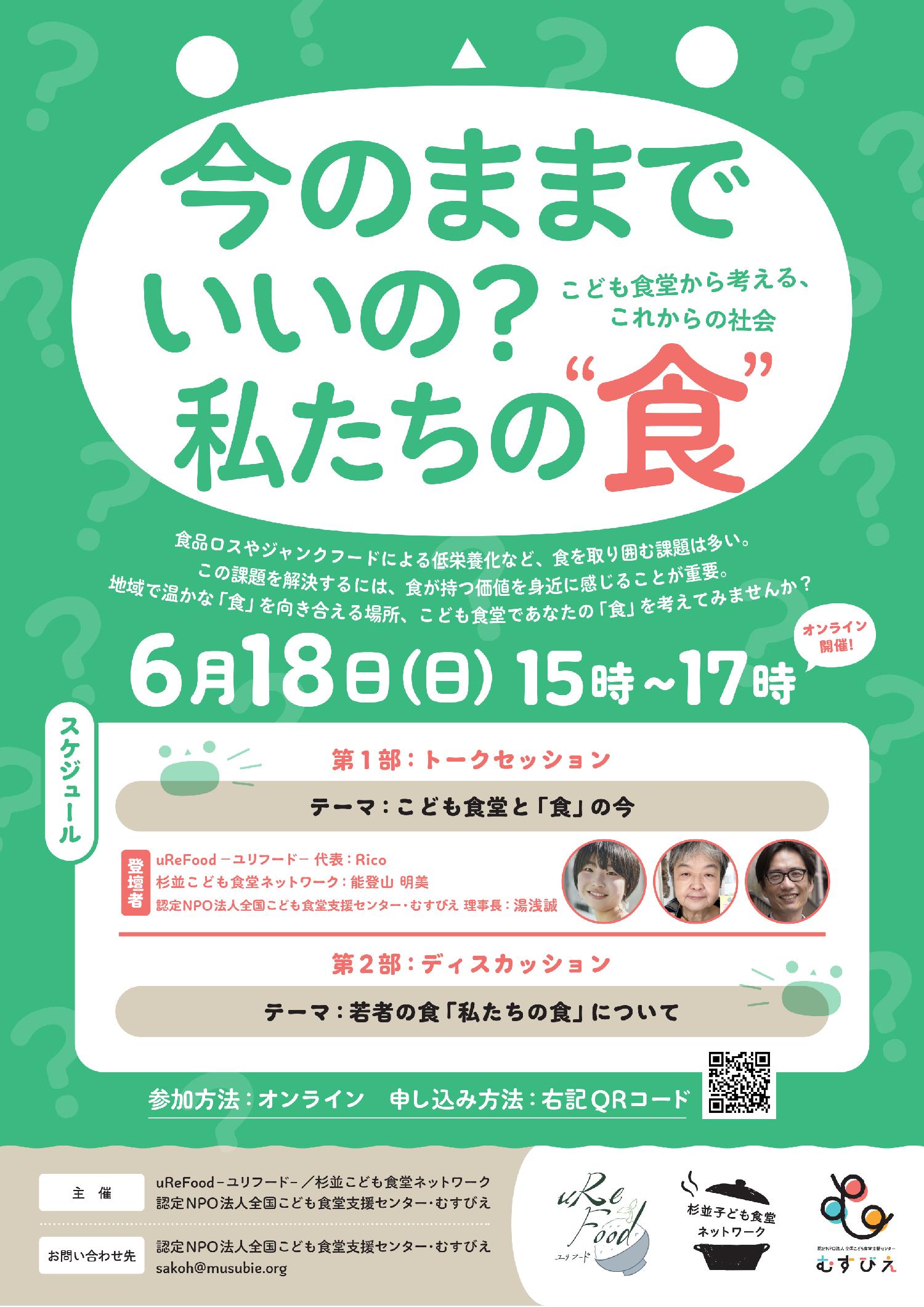 食の問題に取り組む選択肢を”愉しさ”を通して広げる学生団体 uReFood-ユリフード- さんと杉並こども食堂ネットワークさんと一緒に、中高生が直面する「食」の問題を、こども食堂を通して考える中高生向けオンラインイベントを開催します。
