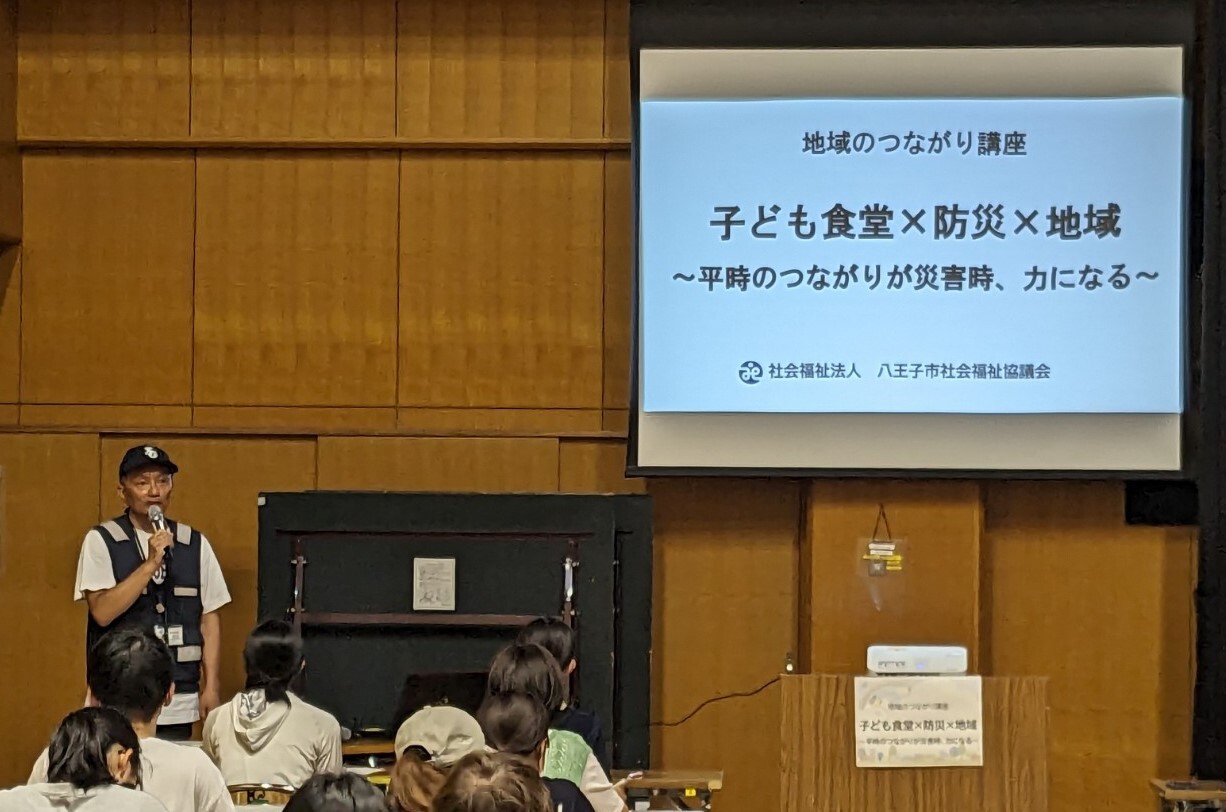 八王子市では、2019年台風19号で浸水被害を経験しており、その体験の振り返りや、平時のこども食堂の活動を知ってもらう交流の他、実践的な防災訓練など、地域の防災力向上に寄与する活動として、こども食堂運営者のみならず、地域の人々を広く巻き込んだ講座と訓練でした。