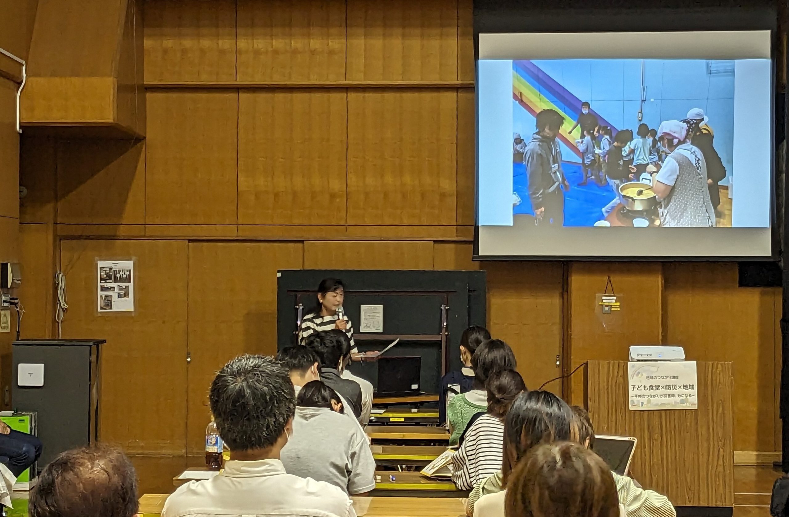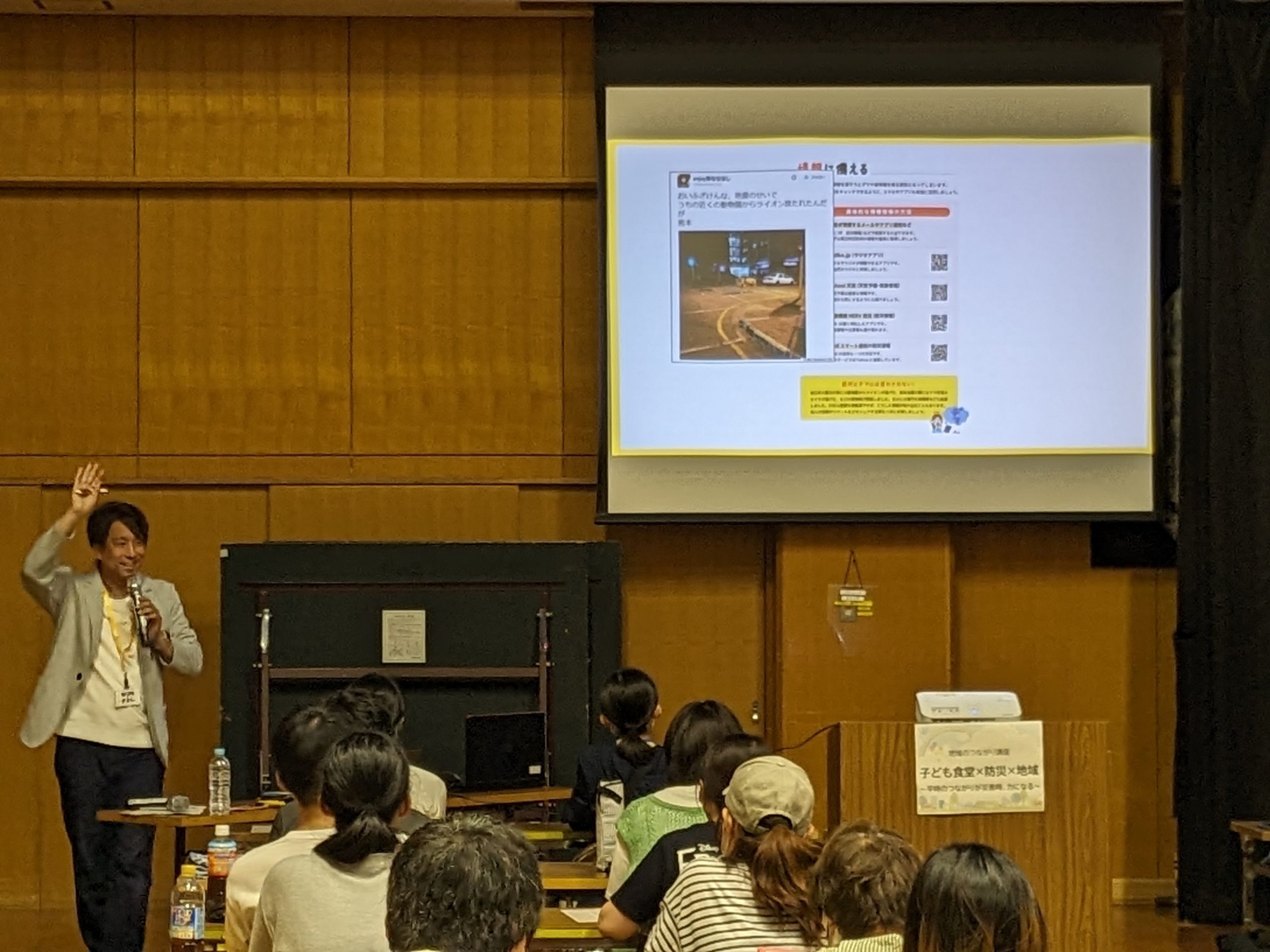 また、自身がこども食堂を運営していて、地域防災に役立てることが出来た原体験をお話しし、こども食堂は平時の食支援だけではなく、地域の多世代が自由に行き交う交流拠点となることで、顔の見える関係が有事に役立つという防災の視点を意識したこども食堂の在り方についてお伝えしました。