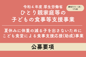 【ご案内】厚生労働省「ひとり親家庭等の子どもの食事等支援事業」募集要項(締切7/11 17:00)