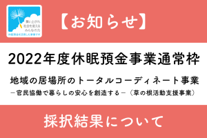 2023-06-07 【お知らせ】2022年度休眠預金事業通常枠「地域の居場所のトータルコーディネート事業 -官民協働で暮らしの安心を創造する-(草の根活動支援事業)」採択結果について 地域ネットワーク支援 その他